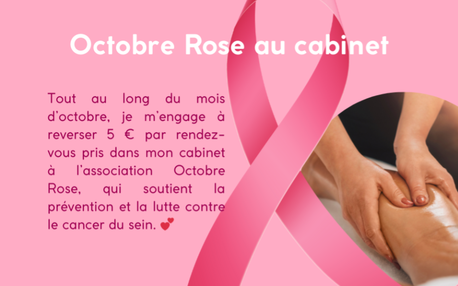 Tout au long du mois d’octobre, je m’engage à reverser 5 € par rendez-vous pris dans mon cabinet à l’association Octobre Rose, qui soutient la prévention et la lutte contre le cancer du sein. 💕